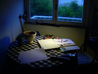 Enquanto lia, dava umas boas risadas. A porta aberta da varanda, se o vizinho do prédio em frente me pega em flagrante vai pensar "aquela doida ali rindo sozinha enquanto olha pra uns papéis". Eu sei que tenho de ler com outros olhos. Atentos de outra maneira. Mas o livro é bom, a trama me chama e não consigo deixar de ler aquelas frases sem sentir emoção, ou sem ficar pensando... Volto e releio agora com olhos profissionais - tem que ser. Mas há livros assim, ou partes de livros assim, ou parágrafos assim. Às vezes me calham coisas que eu nem sonhava. E leio frases que nem sonhava. Frases que me fazem pensar "por que não percebi isso antes?..." ou então "afinal não sou... não sou a única pessoa a sentir... coisas que pensei deveriam ser um segredo bem guardado, e afinal todo o mundo...". E é engraçado que não passam de frases, mas agora feitas de palavras vivas, que me alteram os sentidos.